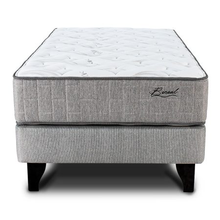 Cama europea de base alta Europea y colchón Aureo 1 plaza, con poliuretano memory Soft en su One Side Top (un solo lado de uso). Parrilla de resorte bonnel biconico, de gran flexibilidad y resistencia. Finas terminaciones. Acolchado lineal massage.