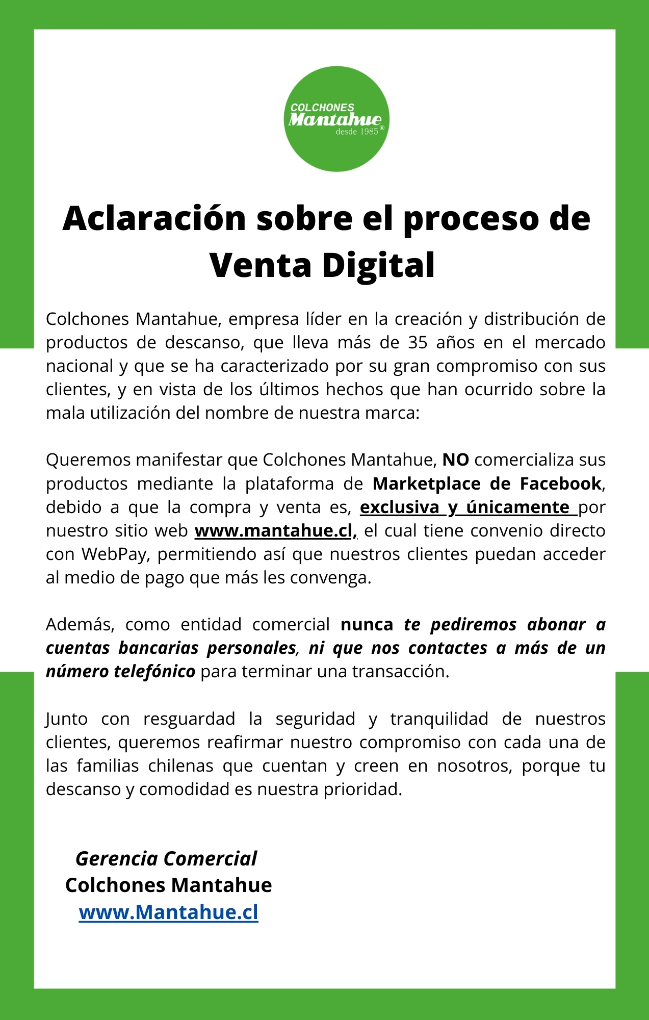Queremos manifestar que Colchones Mantahue, NO comercializa sus productos mediante la plataforma de Marketplace de Facebook, debido a que la compra y venta es, exclusiva y únicamente por nuestro sitio web www.Mantahue.cl, el cual tiene convenio directo con WebPay, permitiendo así que nuestros clientes puedan acceder al medio de pago que más les convenga.